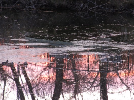 The birds provide a cacophonous backdrop to my untrained ear. I slow my pace when I hit the gravel paths, not wanting to startle deer if I should happen upon one. Rodent-like creatures I mistake for young beaver swim in the shallow ponds. They crawl gingerly across a thin crust of ice leftover from the night.