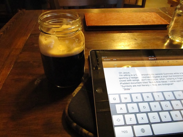 I’m sitting in a Cafe enjoying my second Guinness while a tall young fellow sporting a hedgerow mohawk regales a slight but boisterously talkative crowd with songs I don’t recognize, when, swiping a finger through an iPadded document titled ‘Notes And Ideas’ I come upon this sparkling gem: “Symbols are not literary— they are biological!”