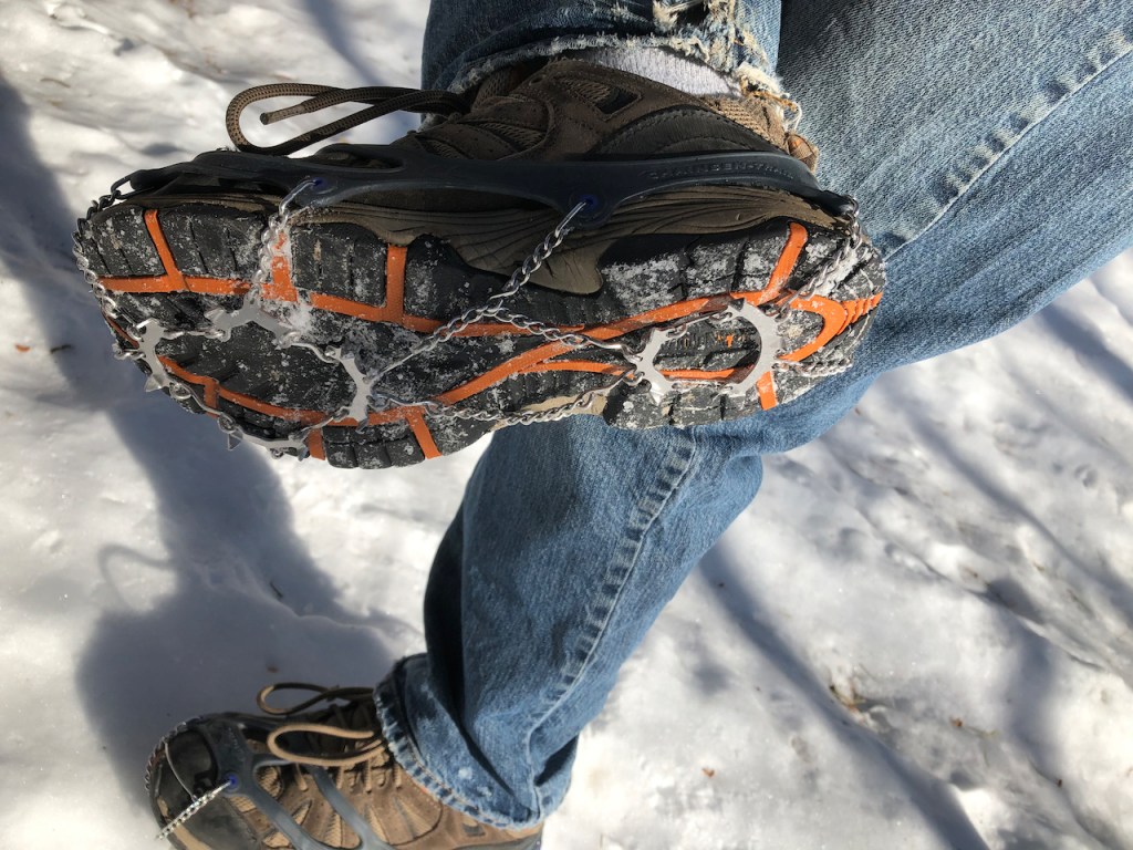 These are my latest favourite toys, cleats for hiking on the hard packed icy trails. They compliment nicely the snow shoes I bought a month ago but don’t get a whole lot of use out of lately because of the lack of snow. Been slowly working myself back into decent shape, which I haven’t been in for probably thirty years! Too much reading and driving and living in cities which didn’t provide enough incentive to get out there and move. However, nowadays when the weather permits I find it hard not to be outside for at least a couple of hours a day.